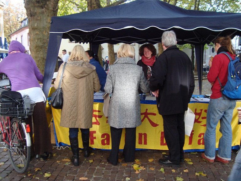 信息台设立在市中心的弗莱堡大学旁边,来来往往有不少中国留学生经过这里。马路边挂起的中德文“解体中共,停止迫害”,“中共不等于中国”的横幅格外醒目。一位从大陆来欧洲考察的中国学者,举着相机问法轮功学员:“我想拍下这两条横幅可以吗?”学员表示欢迎,支持他把这样的信息带回去传递给更多的人。