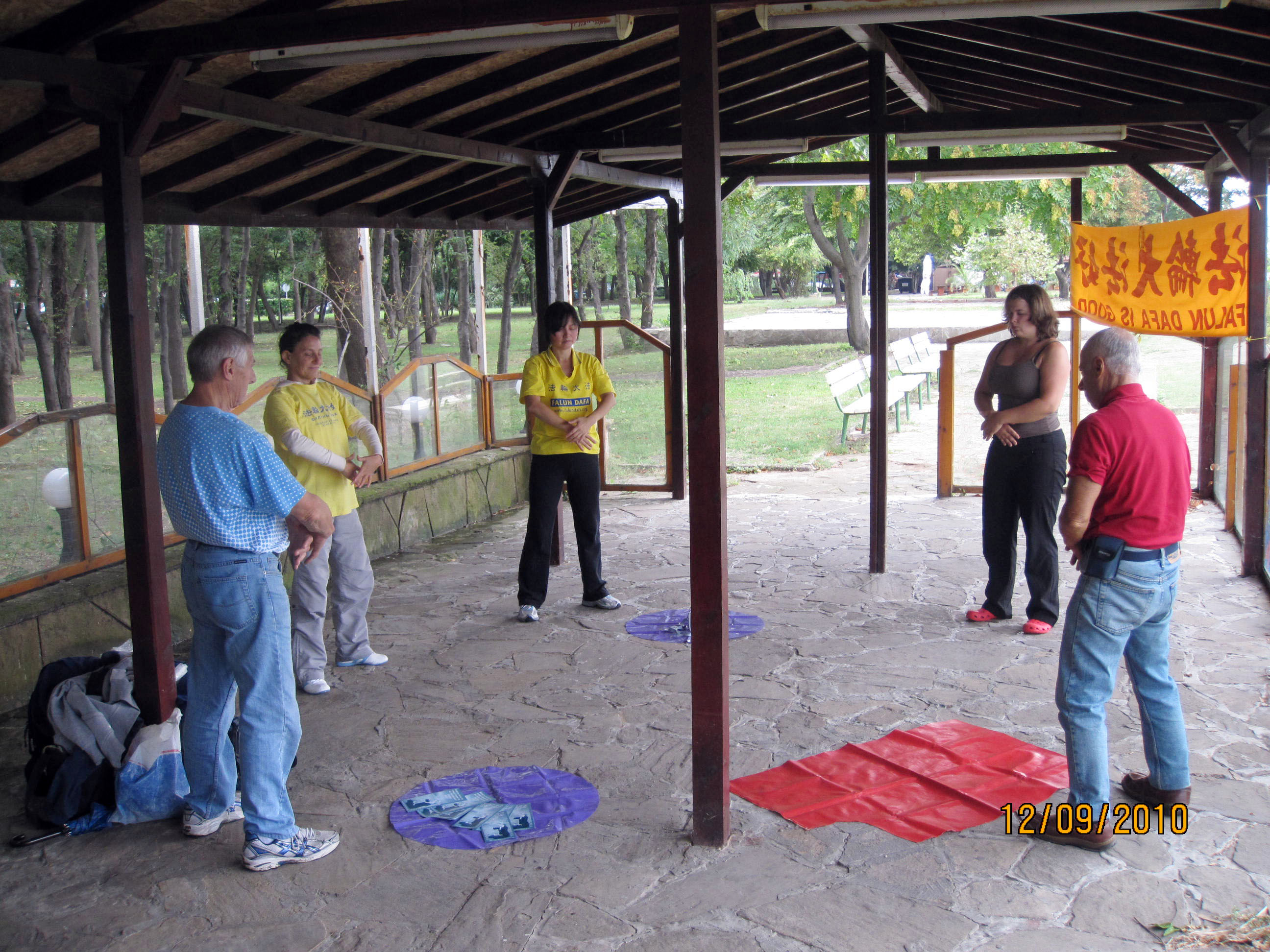 二零一零年九月十二日,布尔加斯当地的法轮功学员和来自科索沃的法轮功学员一起在海边公园炼功。