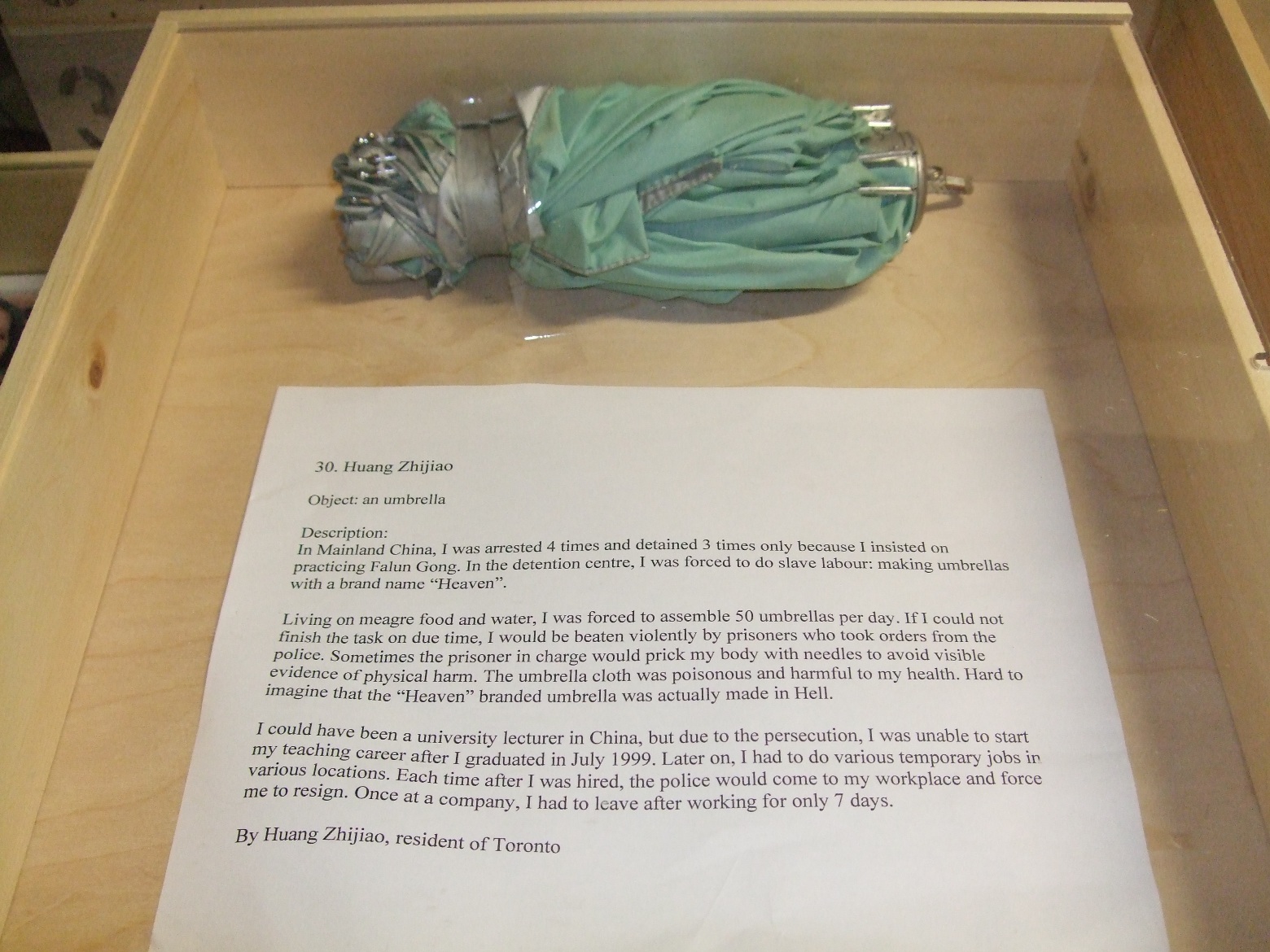 ![]() 来自中国大陆的法轮功学员黄知姣在展品中展出了一把在劳教所做的天堂牌雨伞 |