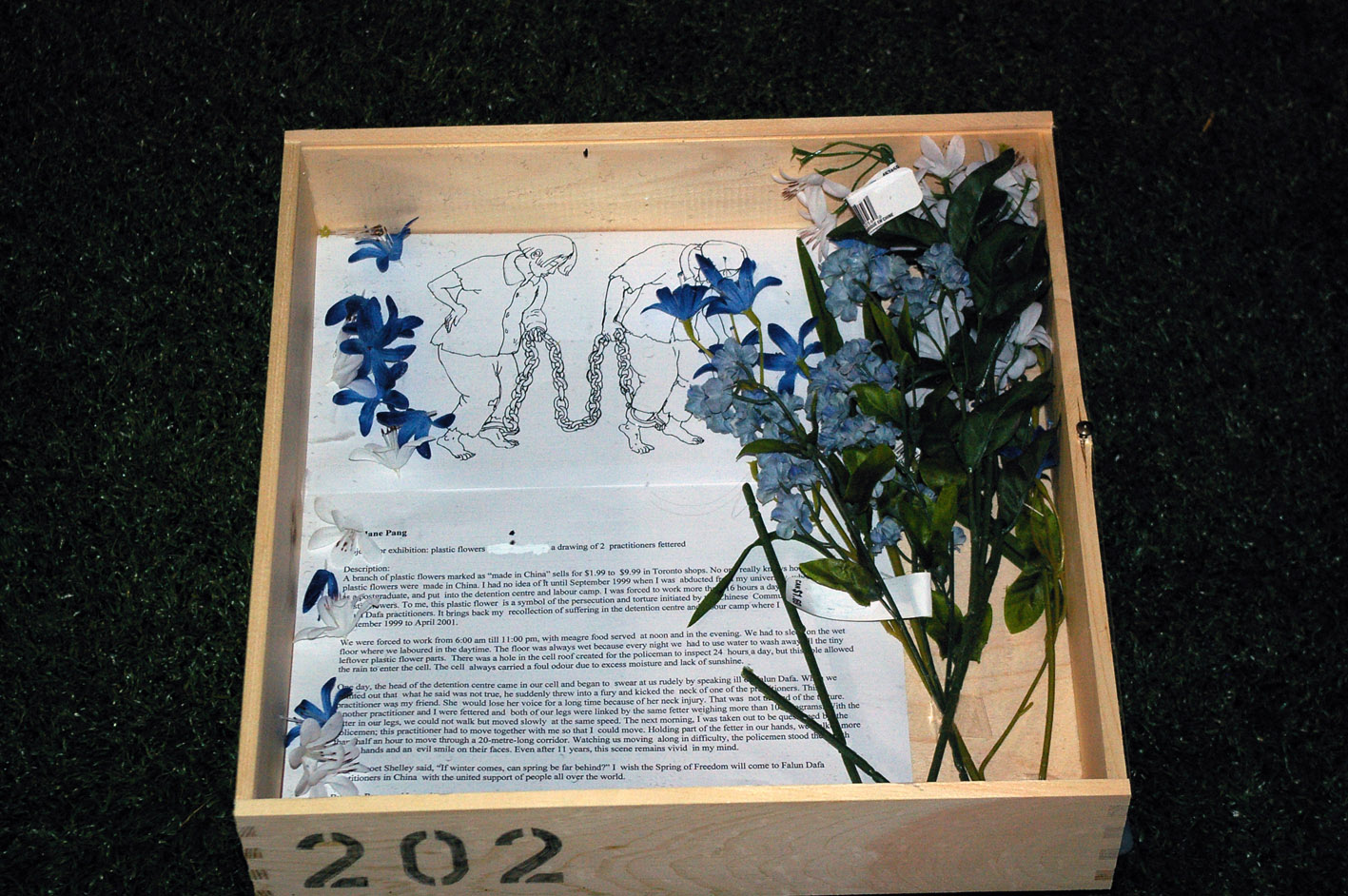 她介绍说:一束标着“中国制造”的塑料花在多伦多商店的卖价是1.99 加币到9.99加币。没人知道这些塑料花到底在中国是怎样被造出来的。我在一九九九年被迫害前也不了解这一真相,直到一九九九年九月起作为在读研究生的我被数次关进了看守所,最后被关到劳教所,被强制长时间做塑料花,才明白其来源。从那以后,中国制造的塑料花对我而言,再也没有了美的内涵,而是中共罪恶的标志。