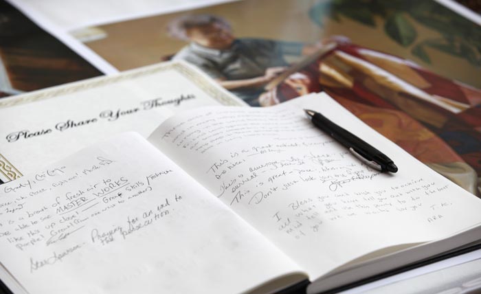 ![]() 观众在留言本上写下感受与对法轮功学员反迫害的支持 |