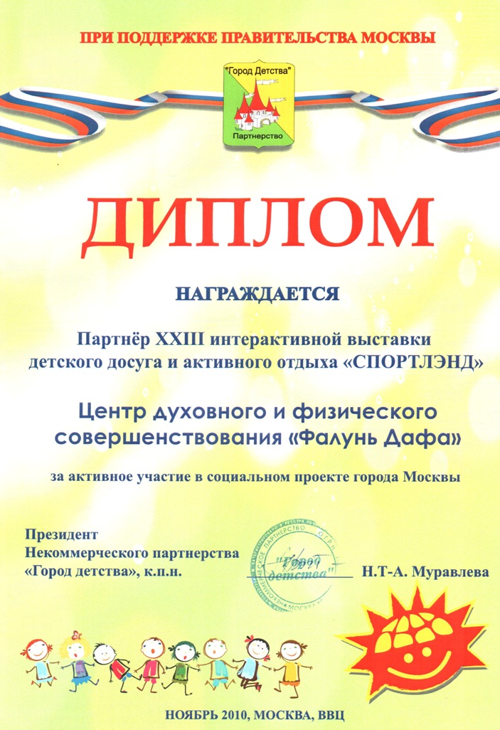举办方颁发的奖状说:“莫斯科市政府支持的第二十三届儿童健康博览会,因积极参加莫斯科市政府组织的社会活动而颁奖给法轮大法中心”。