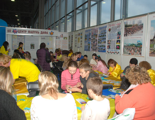 与此同时,在莫斯科的全俄展览中心的另一个馆内还有一个“健康世界”展览,法轮功学员们在那里传播真善忍,也受到人们的欢迎。