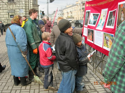 二零零六年四月十五日,圣彼得堡法轮功学员同时在华西里岛和奥赫金中街两处举行街头集会,向俄罗斯民众揭露中共对法轮功的残酷迫害和中国劳教所、监狱等地虐杀法轮功学员,活体摘取学员器官牟利并毁尸灭迹的罪行。