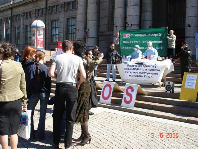 二零零六年六月三日,法轮功学员在位于圣彼得堡市中心的“波罗的海影剧大厦”前举办活动,揭露中共活体摘取法轮功学员器官贩卖,并焚尸灭迹的暴行。