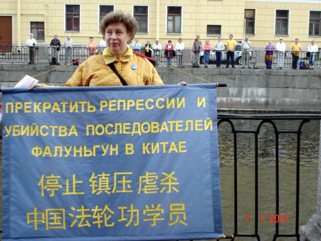 圣彼得堡法轮功学员每个星期六向市民讲真相的活动,已经坚持多年了,几乎走遍了市区每一个地铁口和闹市区。二零零七年七月七日,如往常一样,一名法轮功学员手持中俄文横幅站在中共驻圣彼得堡领事馆门前,数名法轮功学员站在领馆前运河对岸,抗议中共江氏集团对法轮功的残酷迫害。