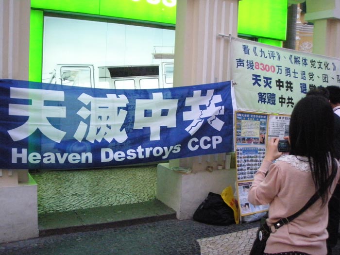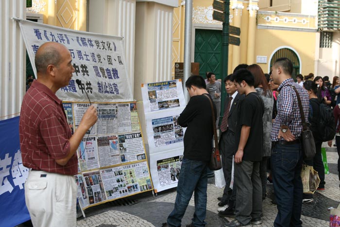 有大陆游客见到学员打出的“法轮大法好”、“天灭中共”及“制止迫害法轮功”大幅横额表示惊讶,随行的友人即表示:“法轮功在香港及泰国的横额还要多。”周日集会将到尾声时,参加完“中葡论坛”的中共代表团成员亦纷纷到玫瑰堂前地游览,学员象对待其他游客一样,向他们派发《·九·评*共产党》书籍及其他资料。看着他们想看却不敢看,一面看着同伴,一面斜视偷偷看大法真相横幅的样子,真实感受到在中共邪*党-统治下,中国人的悲哀和无奈,同时更令法轮功学员们坚定了要让所有中国人了解真相,帮助他们退出中共邪*党-组织的决心。