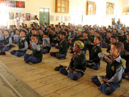 在距离列城(Leh)八公里以外的乔格兰萨尔一所学校大厅里,学员们举办了讲真相的展览和教功活动。数百名学生和教师高兴的了解了法轮大法。有一些教师用了很多时间向学生解释真相展的内容。一名十几岁的学生热情的帮忙贴海报,他告诉学员们说他以前就有一份有关法轮大法的光碟,看了很多遍,里面的一首歌他都已经可以唱得很完整了。他非常感谢学员到学校来举办活动。