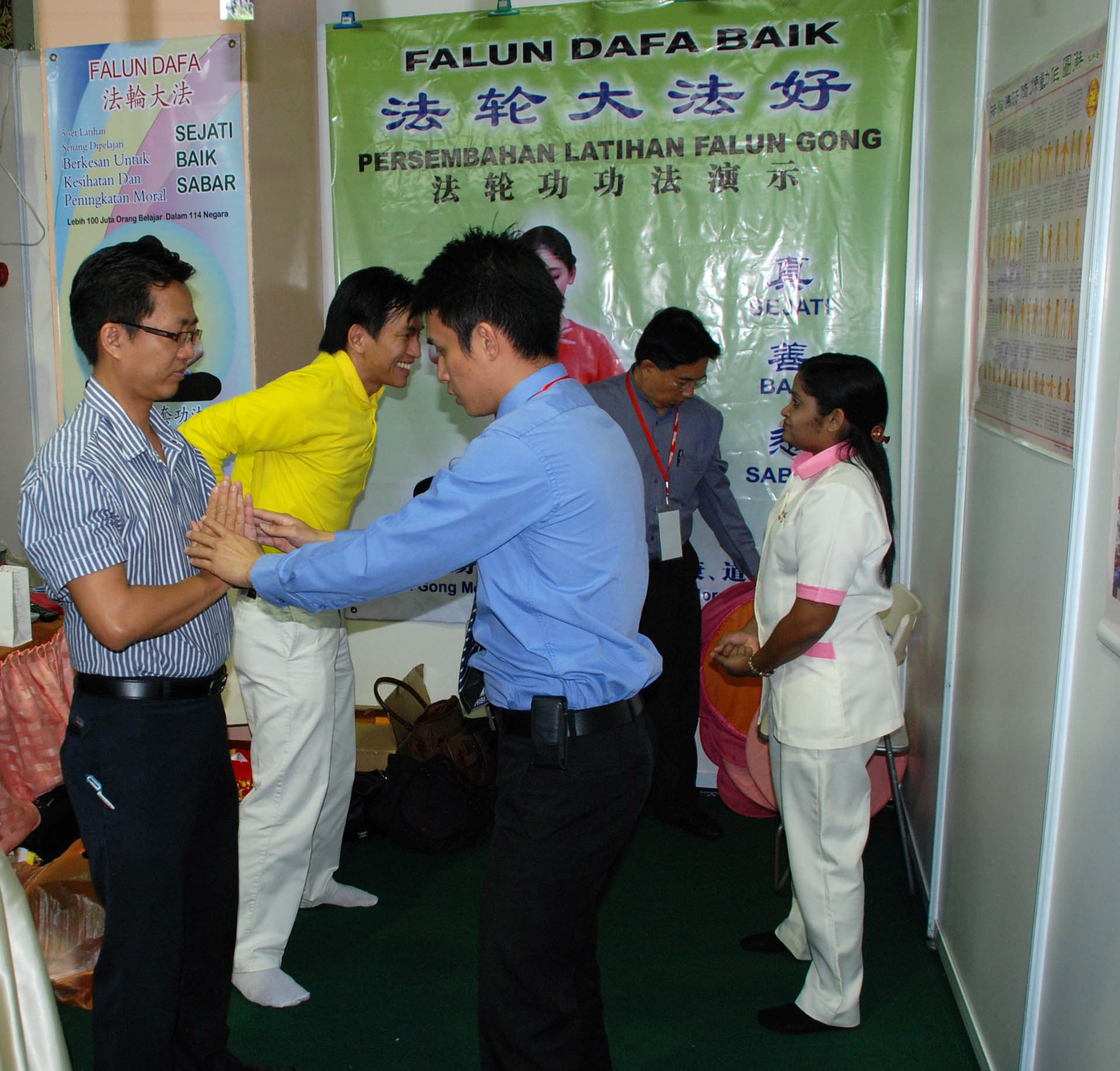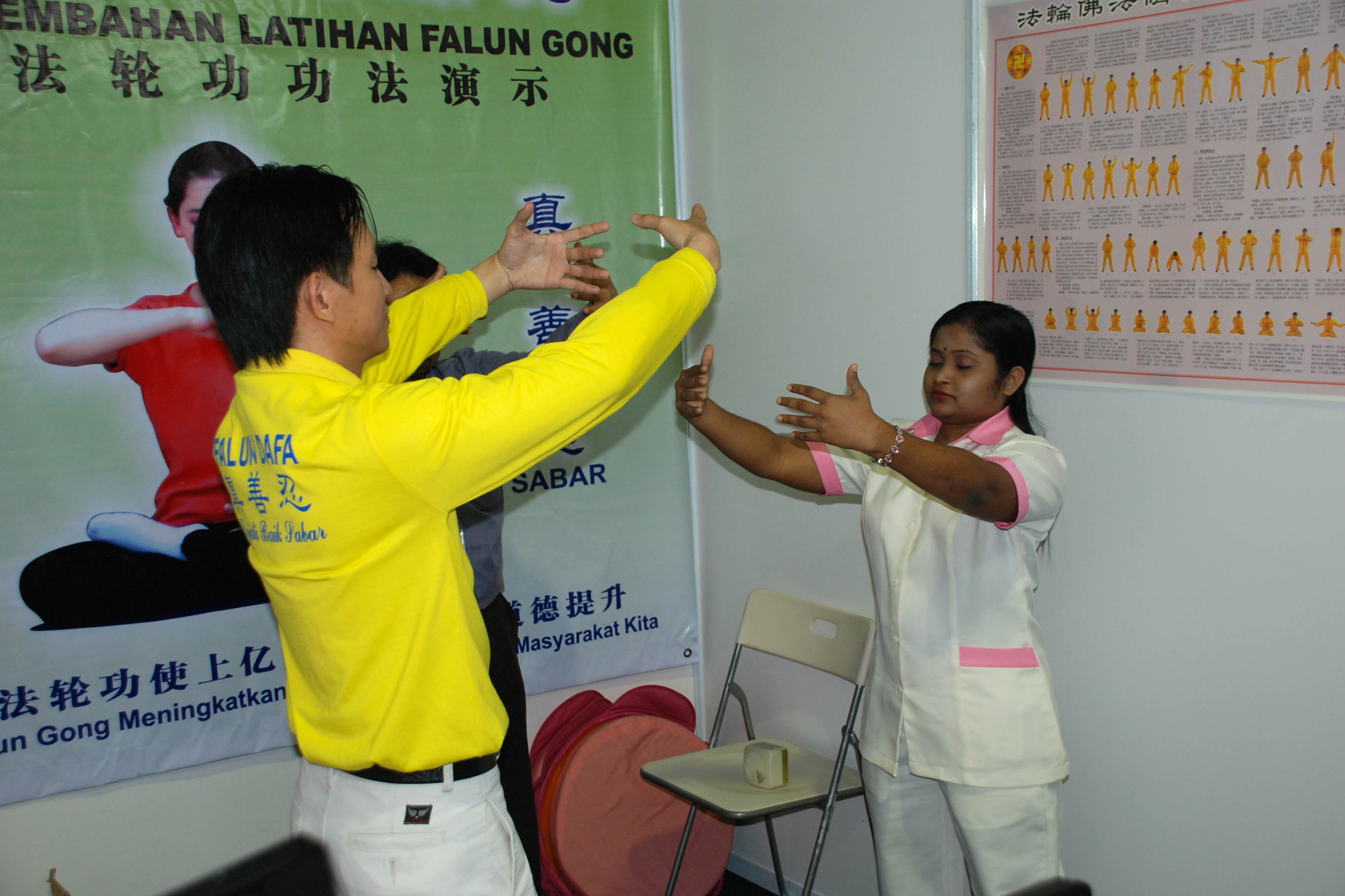 印裔护士卡莫斯(Komathy)在经过法轮功的展位时,主动取阅资料,并当场学炼功法。在五套功法全部学完后,她很开心地表示:“真的很好,很轻松,我感到身轻体健,而且我的注意力可以集中,跟你们在一起炼我感到一股很强的力量,真的很舒服。”