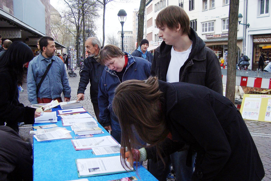 一位德国女士走到信息台前在反迫害的征签簿上默默地签上了自己的名字,然后问道:“这里有很多中国人,特别是有很多中国留学生,她们是否也愿意过来了解这些?”学员说也有个别的留学生害怕,不敢过来,怕中共找麻烦。她说:“我完全能够理解,他们担心自己真实的想法表达出来后,回到中国会有危险。没有自由的生活真的是太糟糕了。祝愿你们成功!”