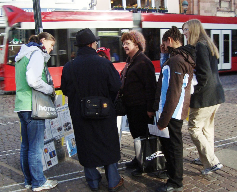 一位刚刚从国内出来的华人女士和她的德国先生路过信息台,学员问她是否知道三:退.的事?她说:“知道,在国内就知道退!党!的事,我们那的人都知道,但是我没入过党、团、队,只是在幼儿园时好象戴过绿领巾。”学员问她的父母是否戴过红领巾,她说:“他们都在农村,没上过学,好象都没戴过。”学员告诉她,如果参加过中共的党团队,千万别忘记声明退出来,并告诉她,请记住“法轮大法好,真善忍好”这九个字,会给你带来福运吉祥。她感激地一个劲地点头。