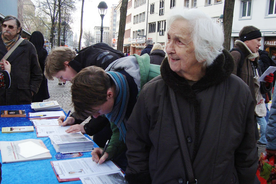![]() 八十岁的德国老太太签名后,饶有兴趣地咨询怎么炼法轮功。 |