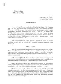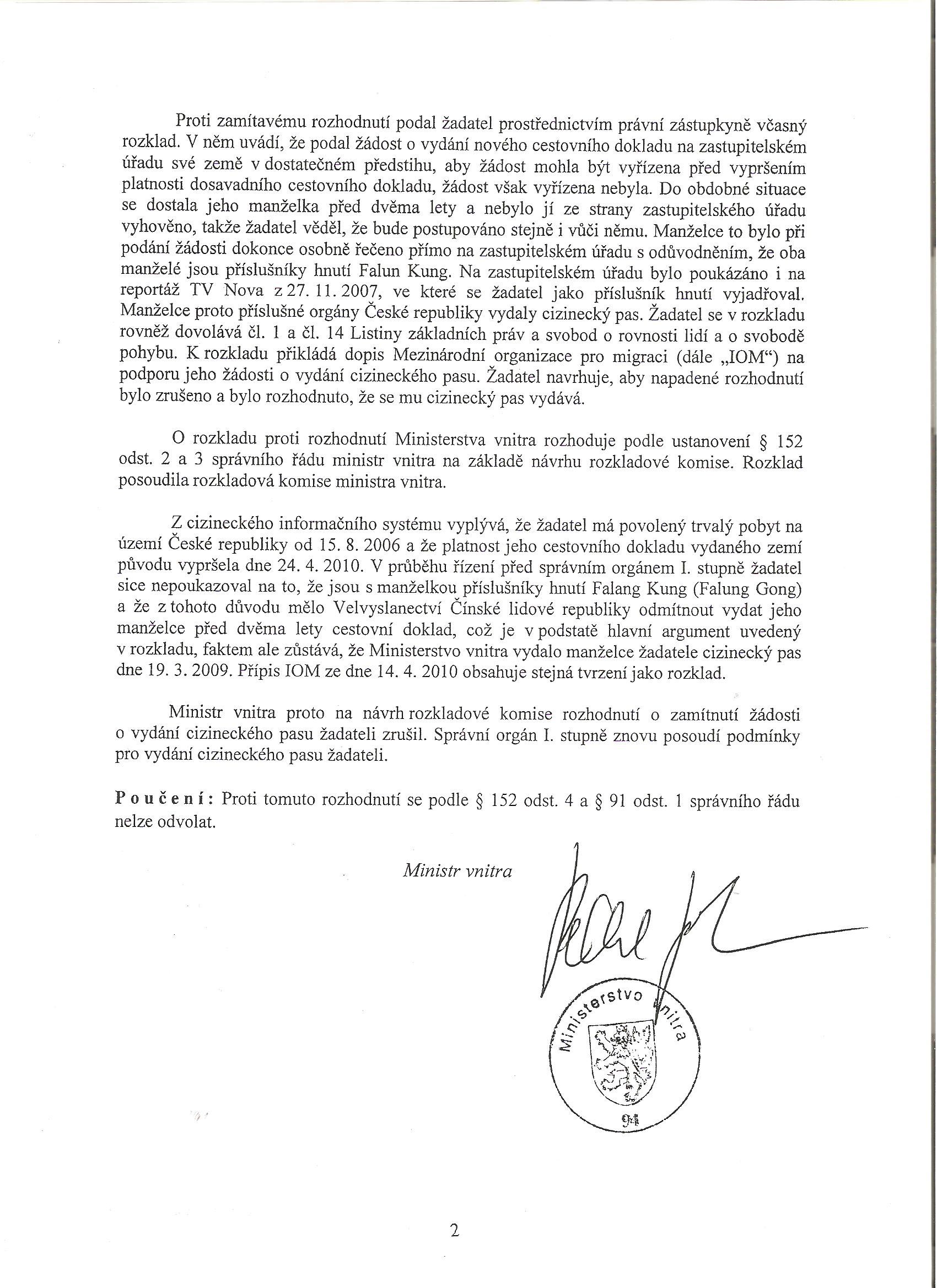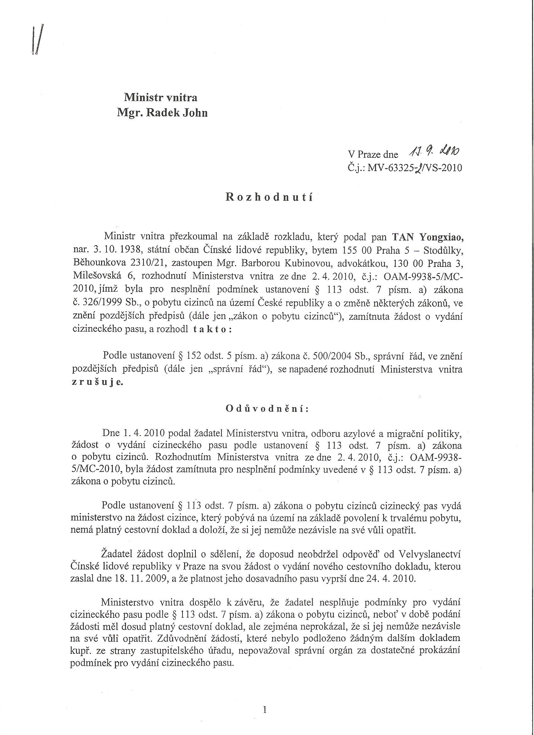 下图:捷克内务部长拉代克•优恩(Radek John)于二零一零年九月十三日签署的决定。