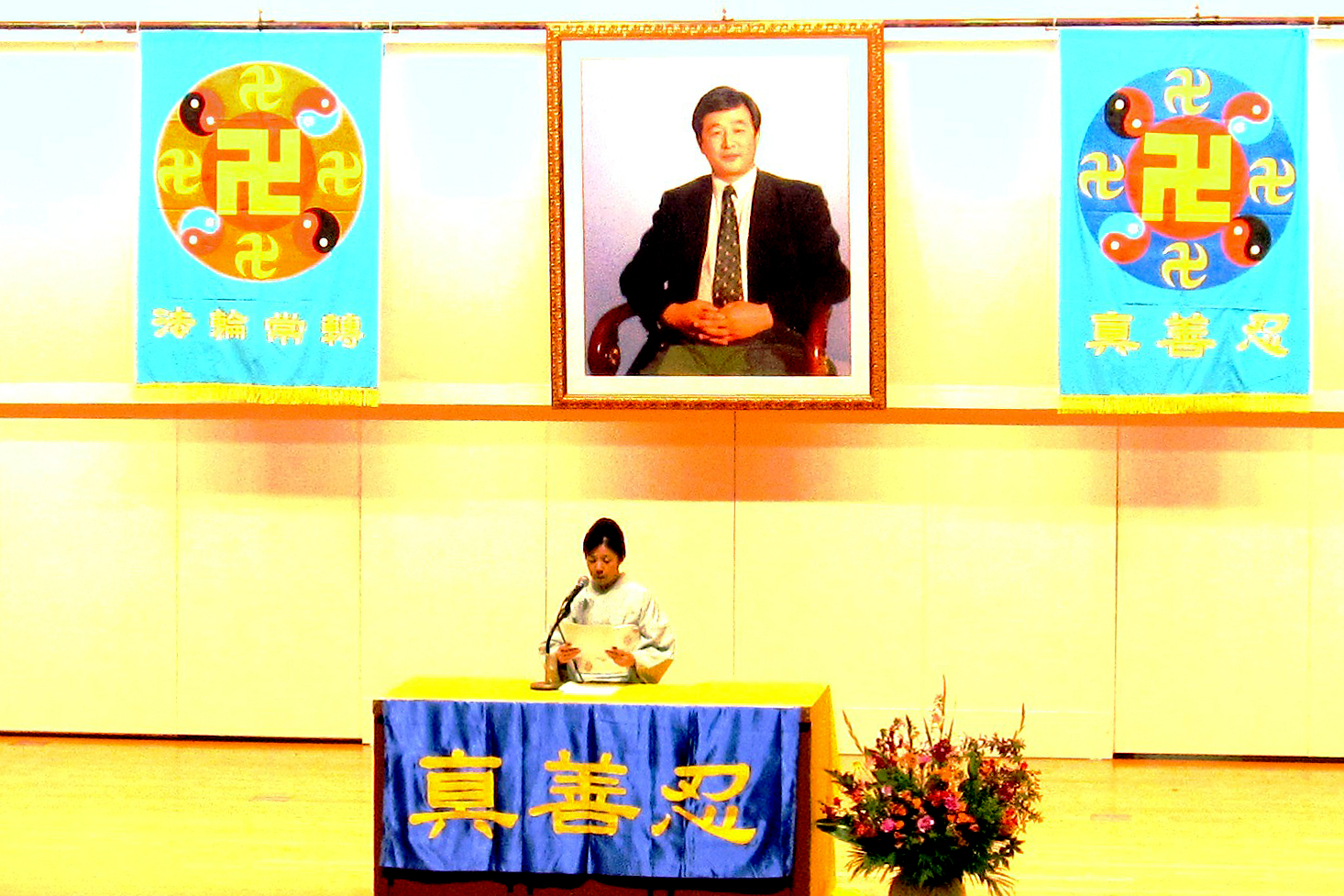 当天,法轮功学员在会场的主席台中央悬挂的是师尊的巨幅画像,两边分别是绣着“法轮常转”和“真善忍”的法轮图。法会于上午十点开始,发言的学员最年长的为七十多岁,最小的十几岁。