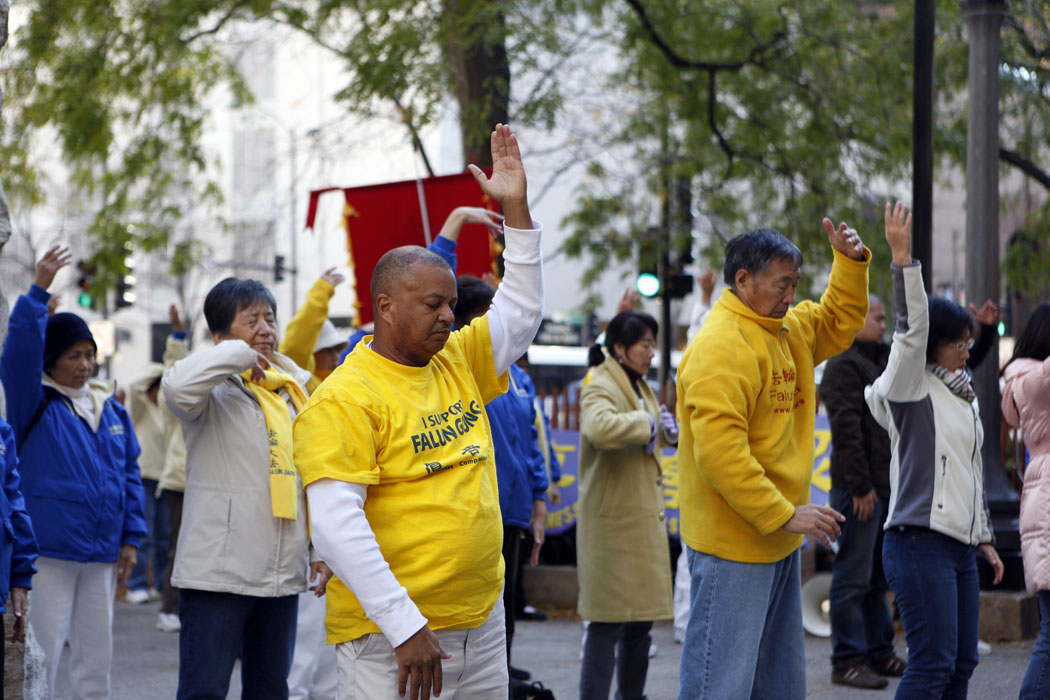 法会的前一天,十一月六日,法轮功学员们在芝加哥市中心举行了大型集体炼功和游行。集体炼功后,游行从水塔(Water Tower)开始,途径最繁华的密歇根大道,最后到达中领馆前。沿途吸引了无数路人驻足观看与拍照。人们认真地阅读横幅上传达的揭露中共迫害的信息,还有路人鼓掌表示对法轮功的支持。学员们在中领馆前再度举行集体炼功,并抗议中共对法轮功长达十一年的残酷迫害。