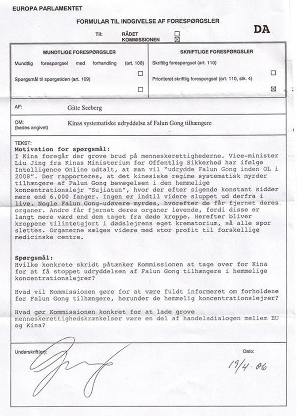 丹麦欧盟议员基特•斯柏克女士(GITTE SEEBERG)二零零六年四月十九日就中共对法轮功学员活体摘取器官的罪行,向欧盟执委会提出质询。她写道: