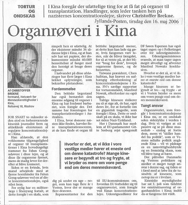 丹麦大报《日德兰邮报》二零零六年五月十六日刊登了一篇题为《在中国发生的器官掠夺》的文章。作者是丹麦非政府组织“中国人权网络”发言人克里斯多弗•布瑞克讷(Christoffer Brekne)。