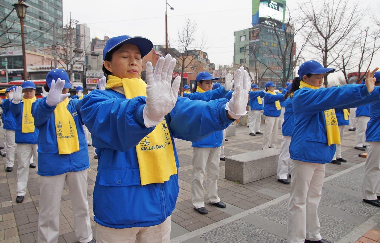 天国乐团首先在梨花女子大学附近的公园里演示了法轮功的一至四套功法。这样的集体炼功,在中共迫害法轮功之前,是在中国各地都常见的炼功场面。
