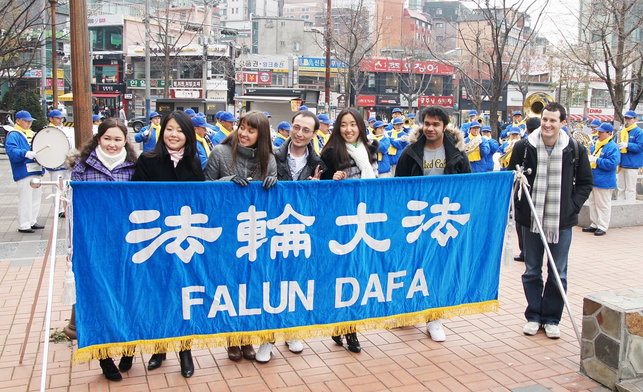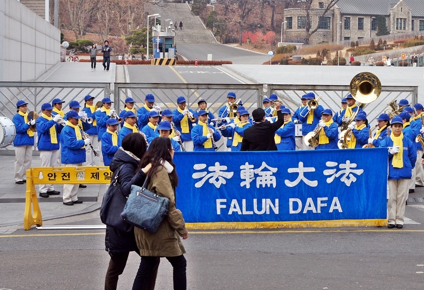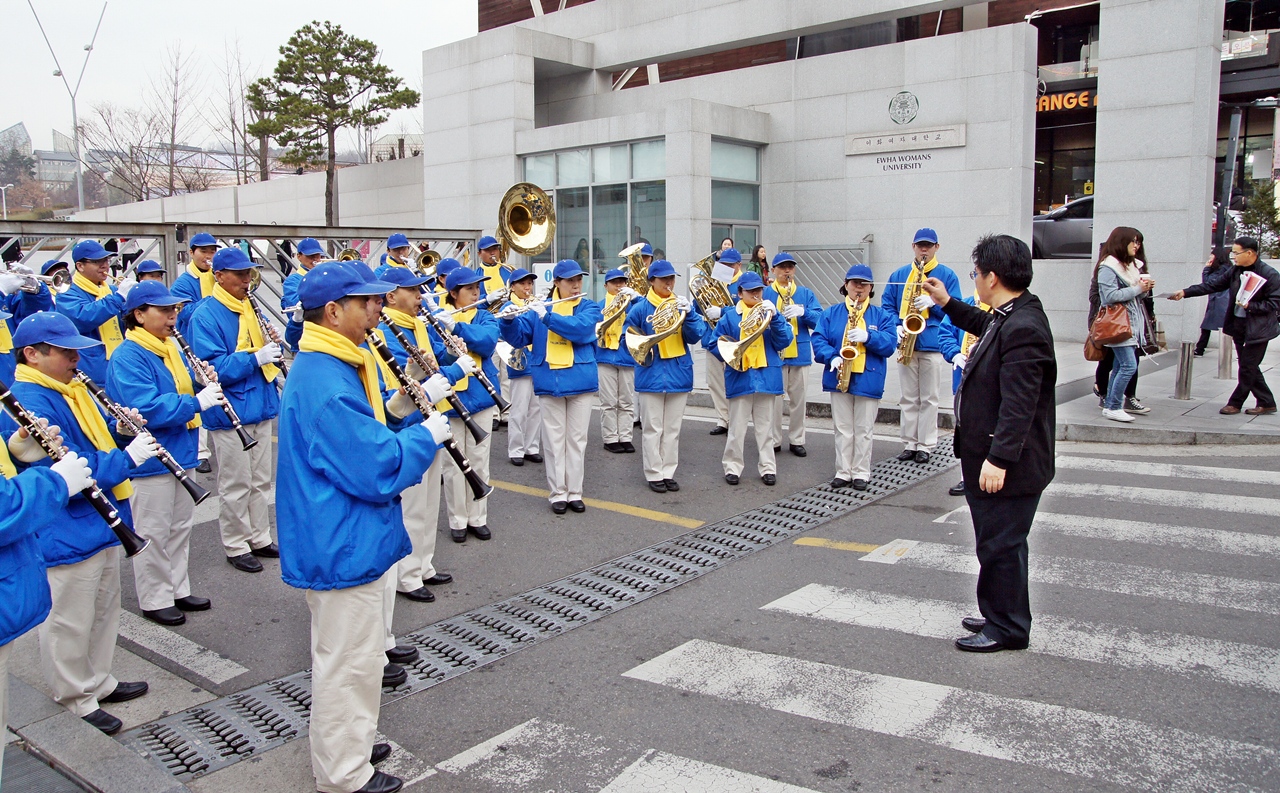 此后,乐团又转移至梨花女子大学的正门前,约演奏了一小时半左右的《法轮大法好》和圣诞颂歌《普世欢腾》等乐曲,响亮优美的旋律,吸引了众多学生及观光客止步欣赏。法轮功学员向来往行人们传递真相资料,很多人听着天国乐团的音乐,接过了资料。