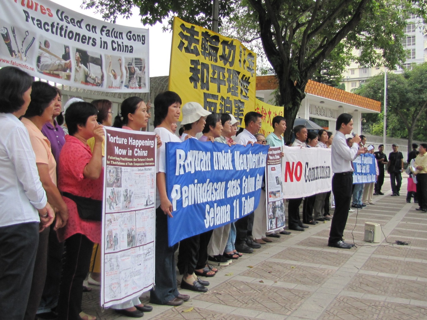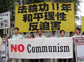 马来西亚法轮功学员在中共驻马使馆前,抗议中共迫害法轮功 |