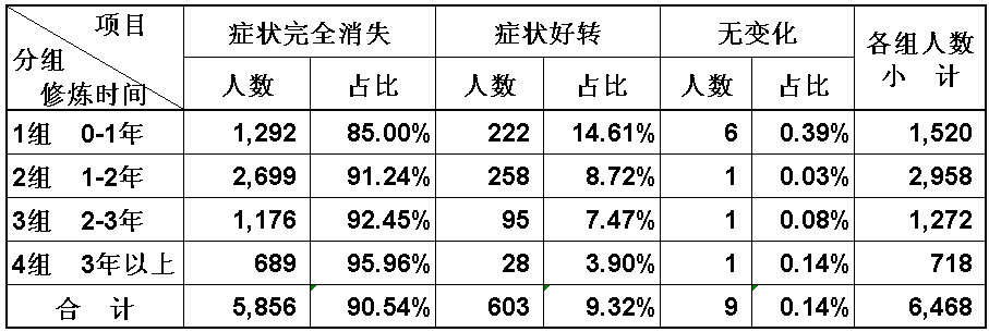 2.3 表3为修炼后人群身体变化情况比较。统计按三类情况判断:一类为疾病症状完全消失并且未用任何药物及其它医疗手段;二类为疾病症状基本好转;三类为症状未见明显变化。表中可见修炼后症状完全消失、未用任何药物者为5580人,占90.12%,症状好转者603人,占9.74%;症状无明显变化9人,占0.14%。症状完全消失者中大多主诉:精神好,走路一身轻,干活没有疲劳感等,其中有一部份老年人头发由白变黑,脸上皱纹减少。