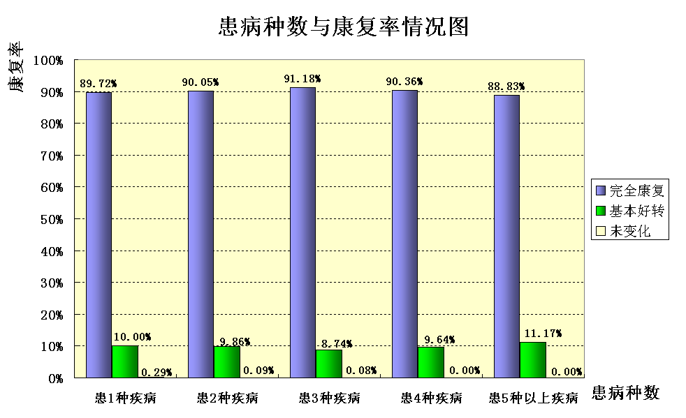 2.4 表4为患病种类多少与身体变化程度的比较。患一种疾病症状消失率与同时患多种疾病症状消失率,分别为89.72%、88.83%。统计学无显著差异(u=0.50<2.58、P>O.01)。