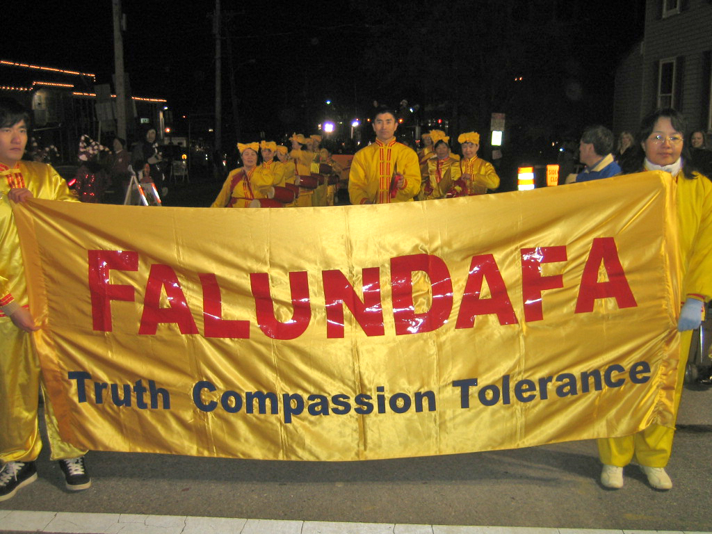 身着具有浓郁东方韵味的金黄色炼功服的法轮功腰鼓队在众多游行队伍中显得格外耀眼,伴随着“法轮大法好”的音乐,咚咚有力的腰鼓声响彻夜空,纯正祥和慈悲的能量震撼人心。沿途许多民众纷纷伸手接过介绍法轮功的传单。当队伍经过主席台时,街道两旁观看游行的民众对法轮功腰鼓队报以热烈的掌声和由衷的敬意。