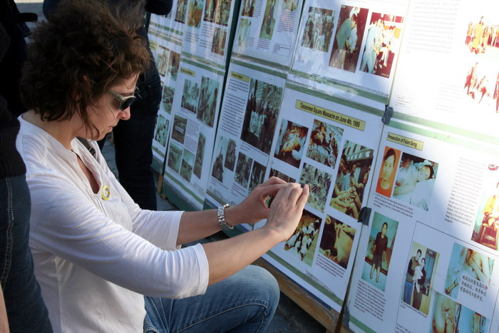 ![]() 来自法国的劳伦斯(Laurence)女士在真相展板前拍摄中共迫害法轮功的罪证 |