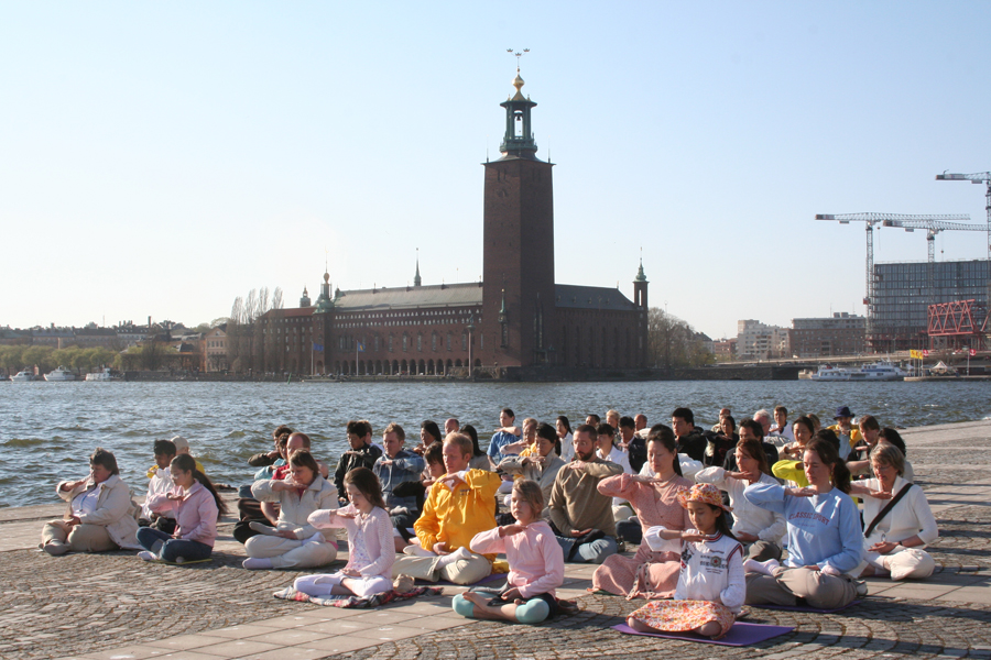 二零零八年七月十二日,瑞典法轮功学员在斯德哥尔摩最热闹的皇宫旁的钱币广场(Mynttorget)举行集会,向来自世界各地的民众介绍法轮功,揭露中共对法轮功长达九年的残酷迫害,同时呼吁瑞典政府和国际社会帮助制止中共在奥运前夕对法轮功学员的加剧迫害。