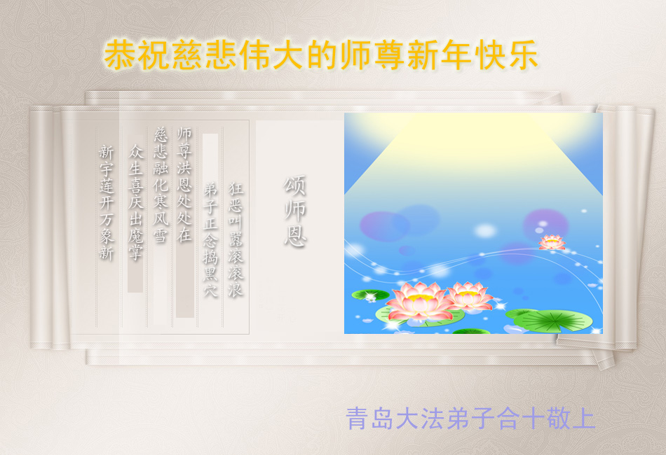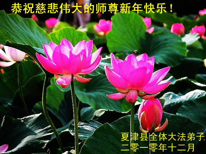 慈悲伟大的师尊您好!为了挽救宇宙无量众生于大劫将至前,您真是“操尽人间事 劳心天上苦”,弟子和所有明白真相的众生对您的浩荡佛恩感激不尽,在此新年到来之际,我代表所有被您救度的众生跪拜师尊,向师尊叩首问候:师尊新年好!师尊辛苦了!在正法進程即将结束前,弟子一定要把着大法坚修、实修,做好证实法的事,圆满完成师尊和众生的心愿,做一朵圣洁的莲,永远绽放、芳芳!