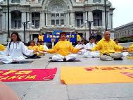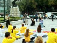 二零零七年五月十三日,墨西哥城的法轮功学员在查普特佩克公园(Chapultepec Park)北部的国立人类学博物馆附近集体炼功,民众被祥和宁静的场面吸引,想进一步了解法轮功真相。