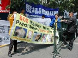 美联社二零零五年九月十二日图片报导,法轮功学员在墨西哥城胡锦涛所住的旅馆前静坐,抗议中共残酷迫害
