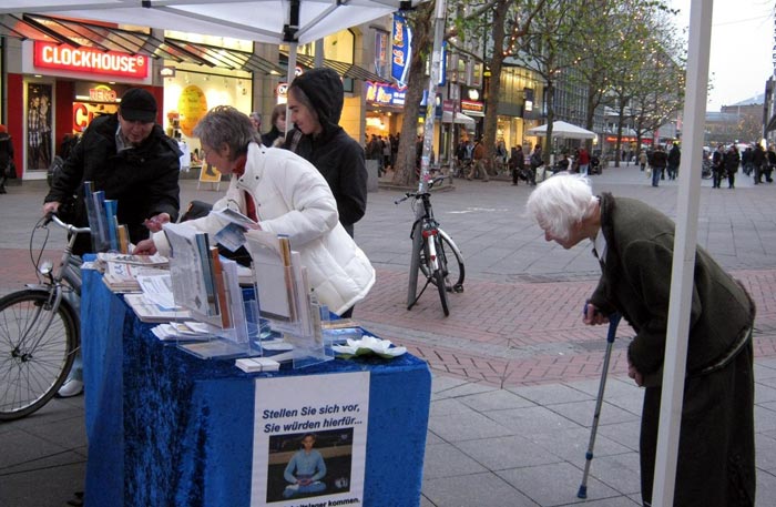 【明慧网二零一零年十二月五日】圣诞节前,在人们都忙着选购礼物的时候,在德国汉诺威城里搭起了一个白色的亭子——法轮大法修炼者在这里举办信息日,告诉人们发生在中国的迫害真相。 打坐的炼功音乐轻轻地从一个小盒子里流淌出来,伴着这祥和的音乐,一部份法轮功学员展示的五套简单易学的功法,而另一部份大法弟子则忙着把有关最新迫害真相的传单发给关注此事的路人阅读。