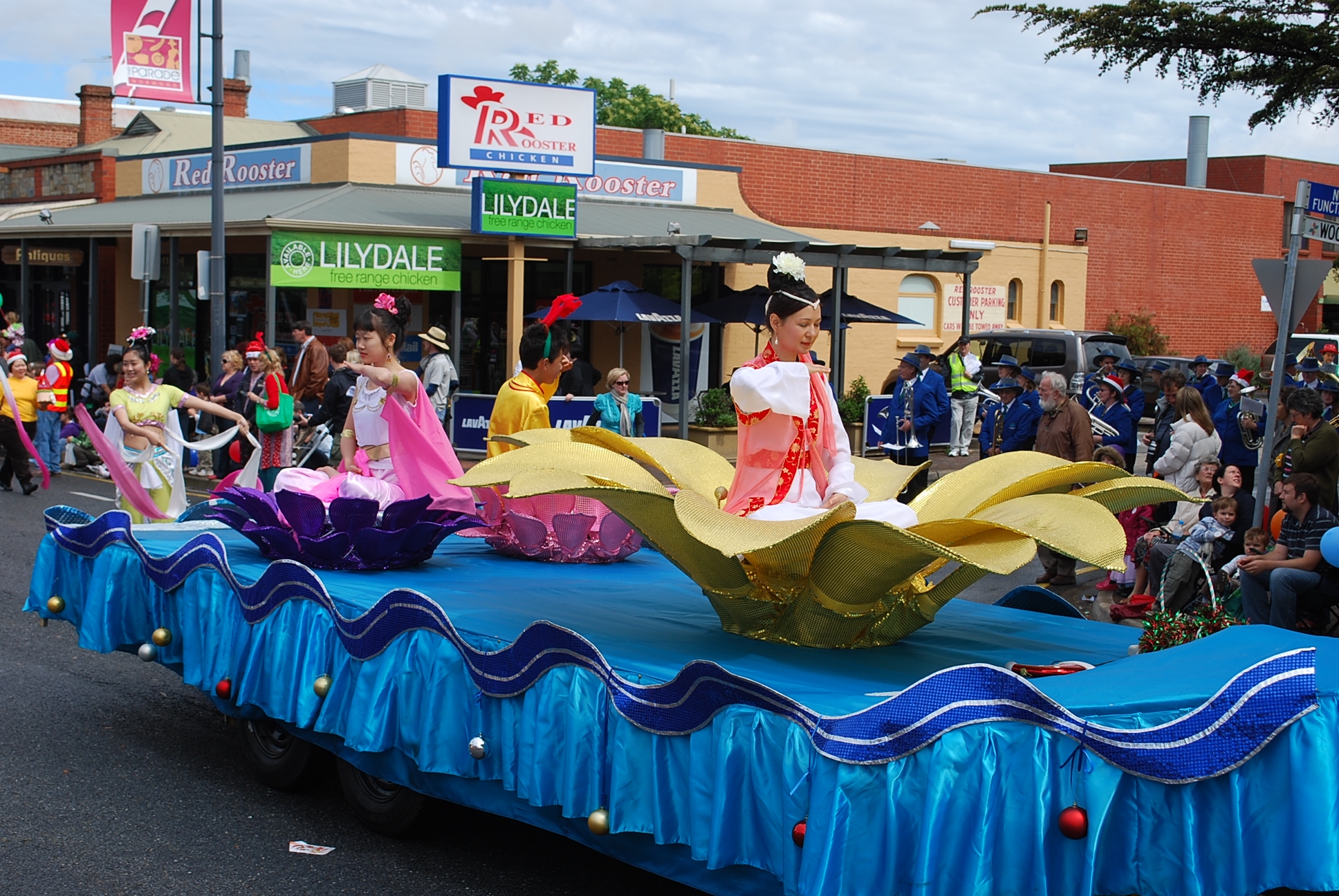 南澳学员参加这些游行已是第七年了。今年游行队伍的开路横幅是蓝底金字“法轮大法”,第二横幅是黄底红字的中英文“真善忍”,而后是学员们自制的金莲花彩车,耀眼夺目。一位女学员坐在金色莲花中祥和地打坐,两位小弟子分别坐在后面的小莲花上。在金莲花彩车后面是仙女起舞,唐装展示。
