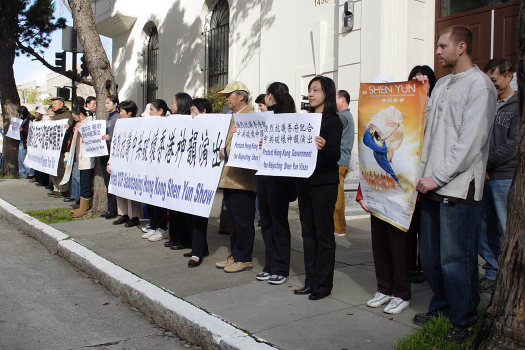 活动组织者张雪容表示,神韵在香港的演出不能在原定的一月二十七日进行,是由于中共胁迫港府无理刁难。我们知道背后是中共在指使,因此我们今天选择在中共领馆举行新闻发布会,抗议中共胁迫香港政府破坏神韵演出。