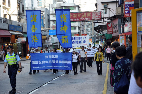 ![]() 近千名抗议港府屈从中共阻挠神韵在香港演出的各界人士,浩浩荡荡游行往西区中联办。 |