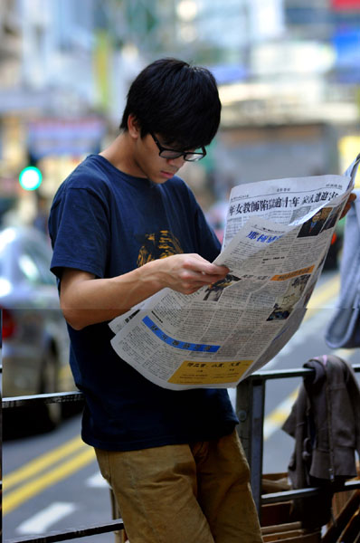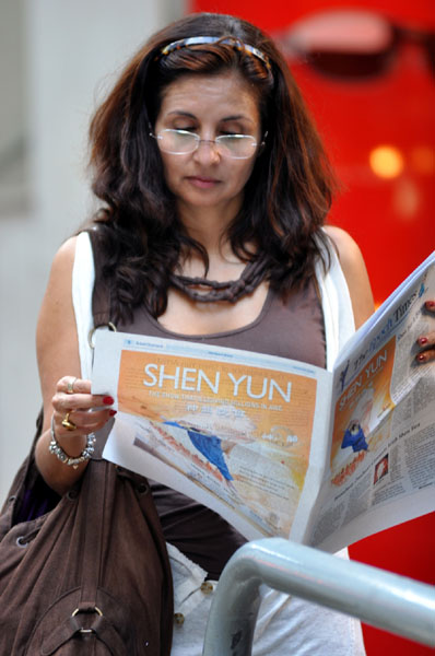 ![]() 游行队伍沿途派发有关介绍神韵在全球广受欢迎及港府破坏神韵演出的特刊,市民及游客纷纷细阅,了解真相。 |