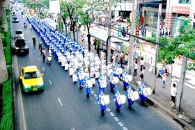 当天的游行非常的成功,两百多人组成的天国乐团一出场立刻吸引了民众的目光,他们很快聚集在路的两旁观看我们的游行,为得救度聆听那神圣的天国圣乐也许是他们久远以来的期盼,后来得知同修们准备的几车的莲花和真相资料也被那善良的泰国民众抢要一空,这也再次见证了这种救人的方式所产生的巨大的效果。在队伍中我无法太关注路边民众的反应,但在我旁边负责维持秩序的警察的行为我却看的仔细,他一边陪同我们走一边笑盈盈的拿起装在口袋中的相机拍照,拍下这永恒的瞬间,在游行中他还不住的翘起拇指表达着对我们的喜爱与感谢。是啊,他们以前所做的非法抓捕我们的傻事其实是因为他们还不明真相对我们还没有完全了解,当真正的看到了那大法无限美好的一面后,怎能不被那真、那善、那忍所感化哪!