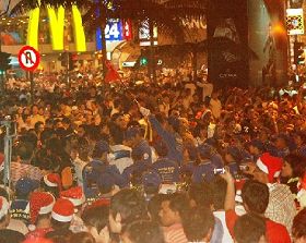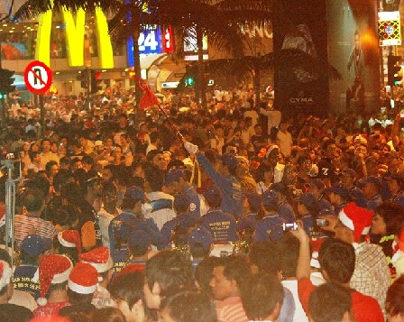 每次重大的节日我们都会在市中心最繁华的武吉免登区演奏似乎已成为了惯例,有时我会想也许这个地区就是为我们而设的吧,去年新年夜我们在这演奏带给众生的震撼似乎还没有完全消退,今年我们又在圣诞前夜来到了这里,而今天来这的众生似乎更多过去年,成千上万的人群挤满了整个街区,既有本地人也有很多来这旅游的外国游客,我们到达后看到他们都在漫无目地的走来走去,互相喷射着节日用的烟雾气来打发着时间,真的好象是在等待着什么到来。
