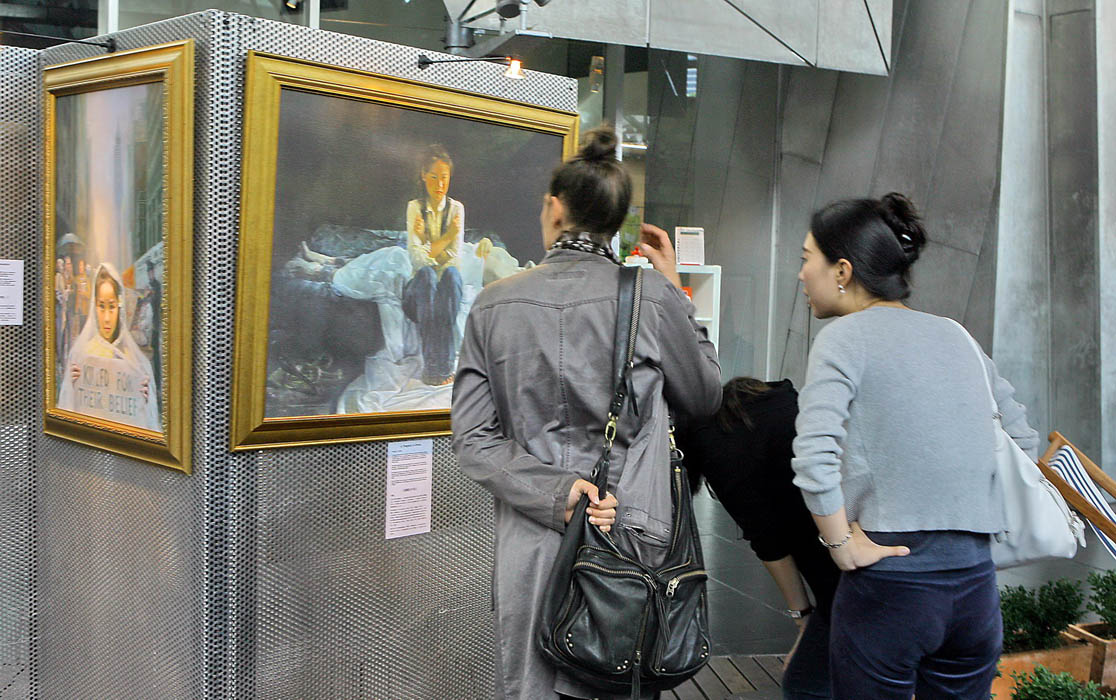 从中国大陆来的大批游客看到画展后,都十分震惊。通过这样的画展,他们一一了解了画中的故事,得知了十年间法轮功在大陆受到的迫害事实,当场多人毅然退!党!,以示正义。
