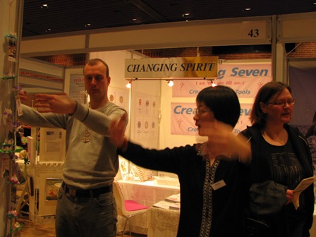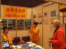 也有学其它气功的气功爱好者来到法轮功的展位询问教功光碟和如何购买《转法轮》回去学炼。其中一位丹麦男士告诉法轮功学员,他去年在丹麦学员全国巡回洪法时已经学炼过第一套功法,后来一直以来都没有再碰到学员。他说这次又这么碰巧,刚好在博览会上遇到法轮功学员,他立即表示要学完所有功法,回去一定要好好炼。他马上就和学员现场学炼全部五套功法。