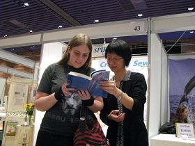 另一位展位负责人是一位泰国小姐,她走到法轮功的展位说:“我就想要买佛家音乐 CD!”原来这位小姐听到了播放的《普度》、《济世》音乐,感觉不一般,要购买CD.学员手头没有《普度》、《济世》音乐CD,因此告诉她下载的网址,进一步向她讲解了法轮功的真相。