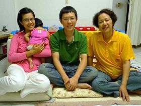 ![]() 修炼后的江连泉(中)象个温文儒雅的大男孩,左一是玉伦与女儿,右边是岳母。 |