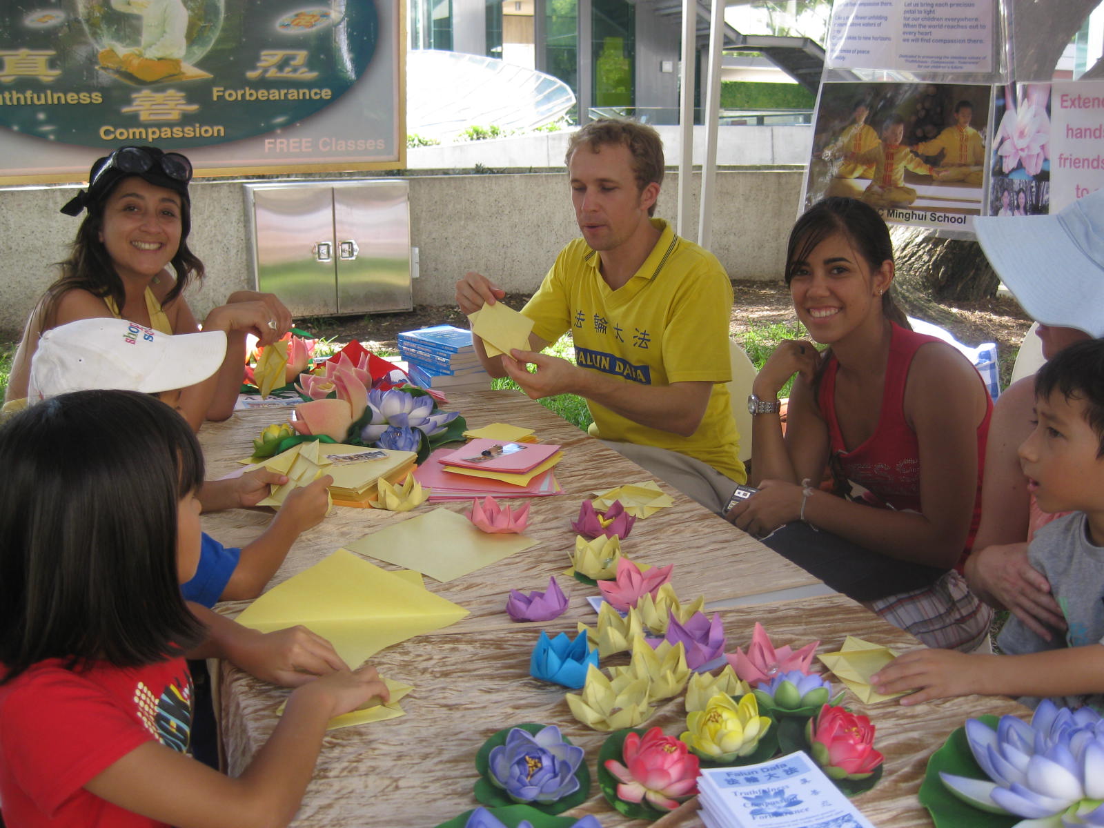 法轮功学员在多元文化活动上教民众折叠纸莲花 |