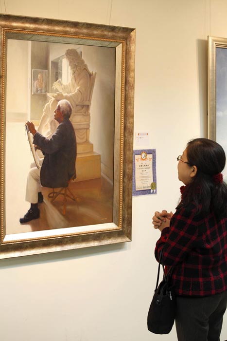 ![]() 看展观众专注欣赏杨翠华全球华人油画大赛铜奖作品“专注” |