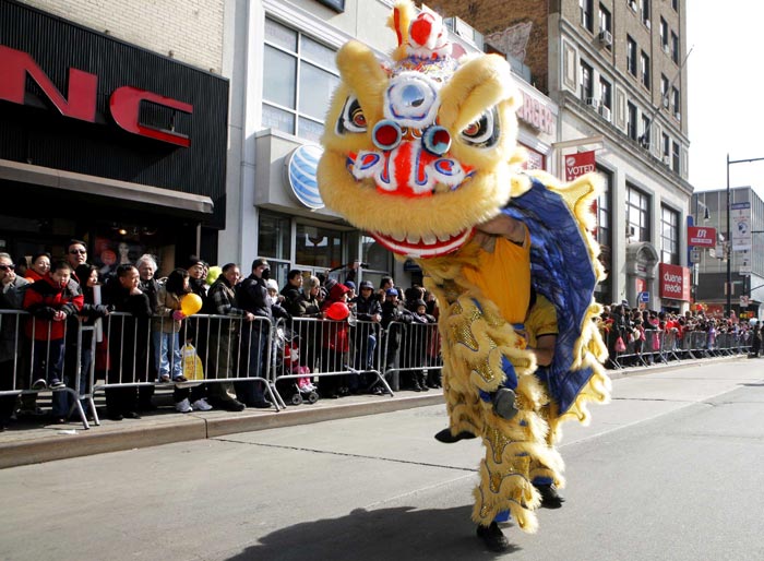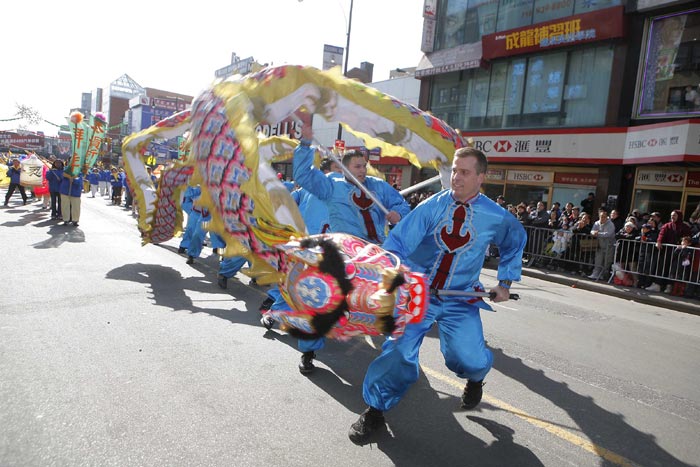 天国乐团之后是蓝底金字的大对联,“贺新年春到人间,真善忍为你而来”,横批“恭贺新禧”。手持莲花的唐朝仕女款款而行。其后的 “彩龙”和“金狮”,龙腾虎跃,向大家贺岁,更是增添了节日的气氛。