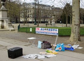 二月十五日,法国“退出中共服务中心”成员成先生在著名的巴黎旅游景点——埃菲尔铁塔附近向大陆游客播放录音和分发资料,揭露中共迫害中国人民、迫害法轮功学员,劝说大陆同胞认清中共本质,退出其组织。当时,成先生遭到一群中国游客辱骂,其中一人用大石头行凶,成先生头部被砸出五厘米长的伤口,险些伤及眼睛。该凶徒又狂暴地掀翻摆放资料和音箱的桌子。接到报警后,法国警察及时赶到,打人凶手被当场制服、逮捕。