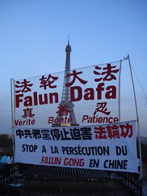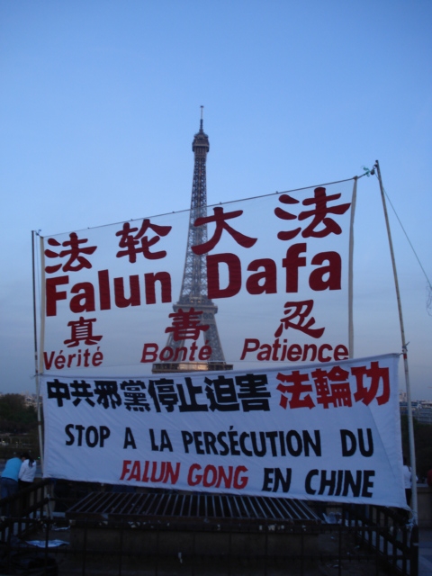 自二零零五年以来,为揭露中共邪恶本质、制止其迫害法轮功,一些法国法轮功学员经由合法申请手续,经常在埃菲尔铁塔附近设立展板,播放录音,散发《·九·评*共产党》,揭露中共迫害百姓的事实,劝说每天众多的中国游客退出中共、共青团和少先队(三:退.),据粗略估计,至今已有近万中国人在此“三:退.”。