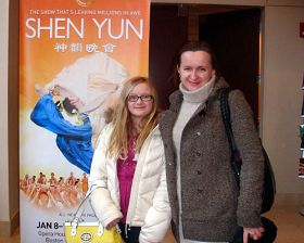 ![]() Freglich女士和女儿在神韵海报前留影 |