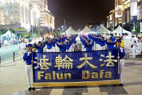 大约晚上十时,天国乐团成员排列成弧形的队伍,为现场观众演奏了《法轮大法好》、《法鼓法号震十方》、《送宝》、《欢乐颂》、《普世欢腾》等曲目,吸引了大量的观众围观,也为刚刚跑完的参赛者缓解了劳累。在演奏过程中,法轮功学员向民众派发了许多大法真相资料,人们纷纷表示非常的感谢。